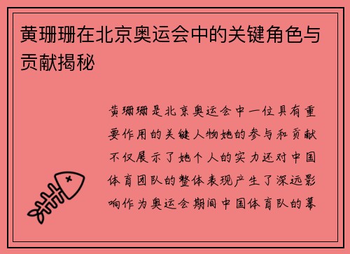 黄珊珊在北京奥运会中的关键角色与贡献揭秘