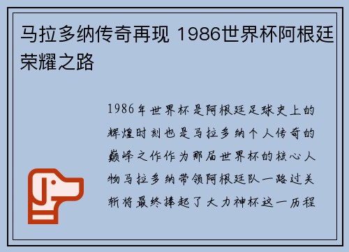马拉多纳传奇再现 1986世界杯阿根廷荣耀之路