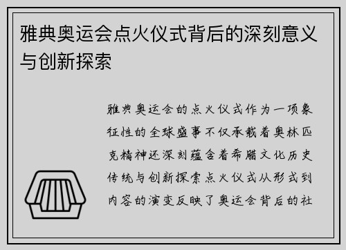 雅典奥运会点火仪式背后的深刻意义与创新探索